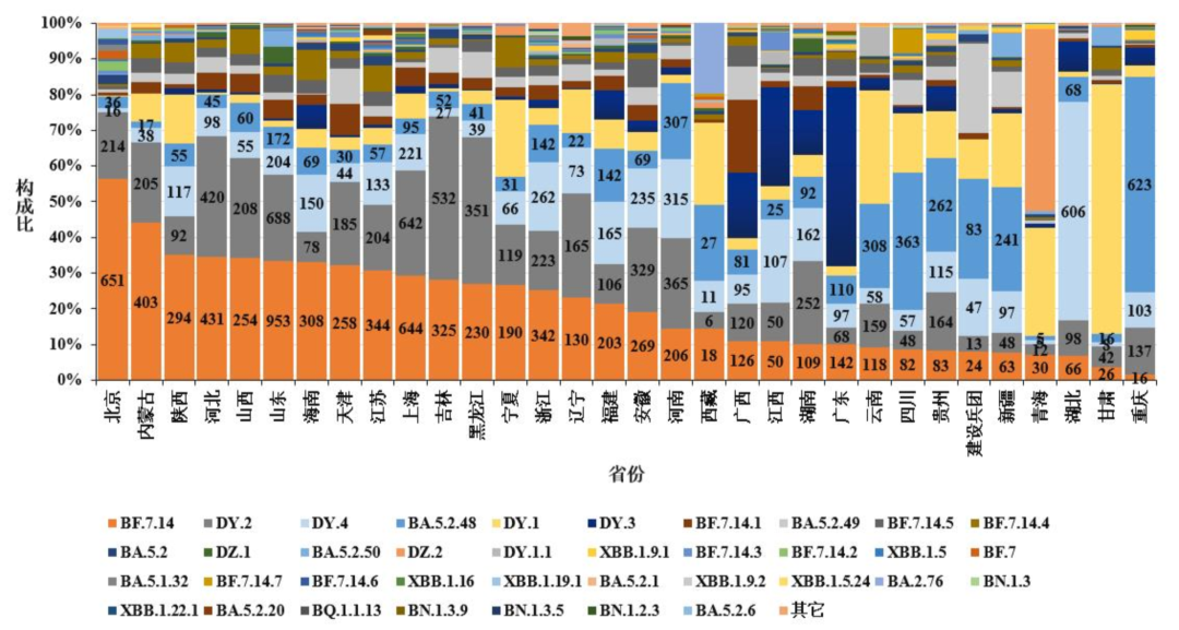 根据中国疾控中心截止2023年4月20日的数据,全国共报送41681例本土病例新冠病毒基因组有效序列,均为奥密克戎变异株,涵盖158个进化分支,主要流行株为BA.5.2及其亚分支(占比 66.2%)和BF.7及其亚分支(占比 29.8%)。