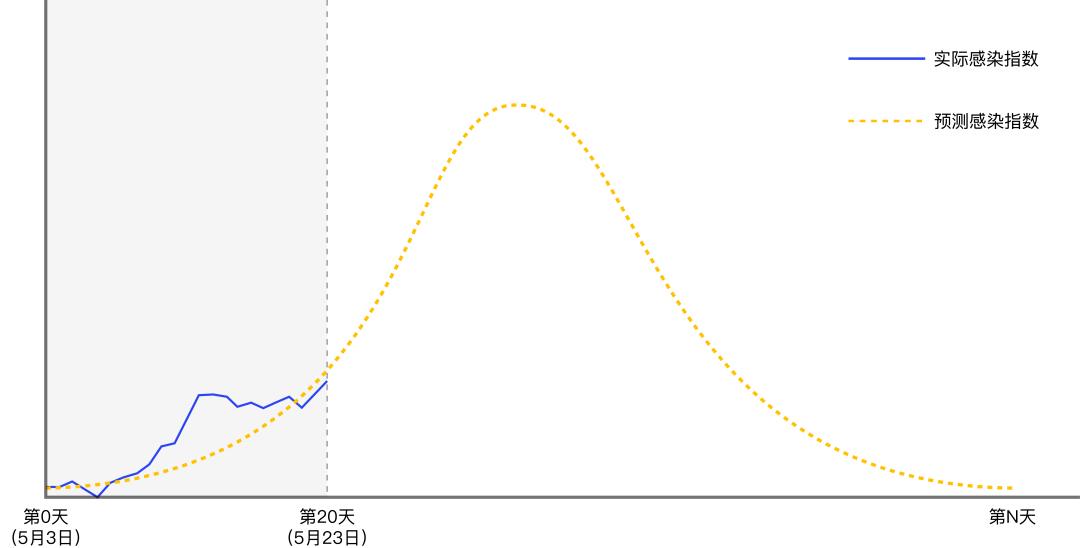 那么本轮疫情结束时,人群感染指数面积应会是多少?根据美国和韩国的感染数据可以计算出,第二波疫情的指数面积相较首轮疫情通常会很小,通常在20-30左右。