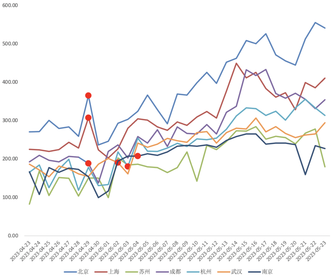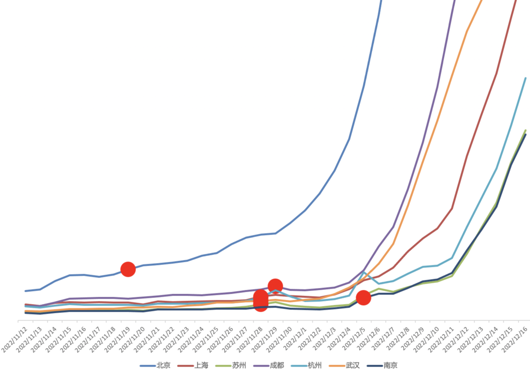 全国主要城市“二阳”疫情起点(红点为各城市疫情开始时间)