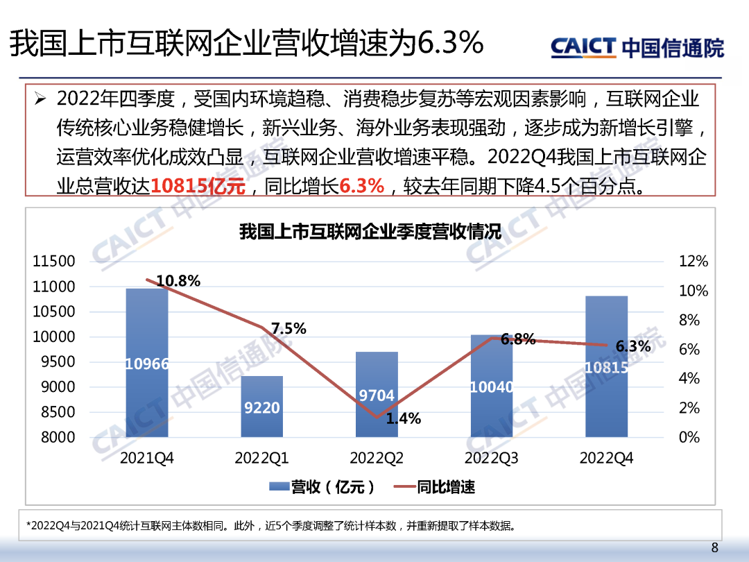 营收方面,2022年Q4我国上市互联网企业营收为6.3%;