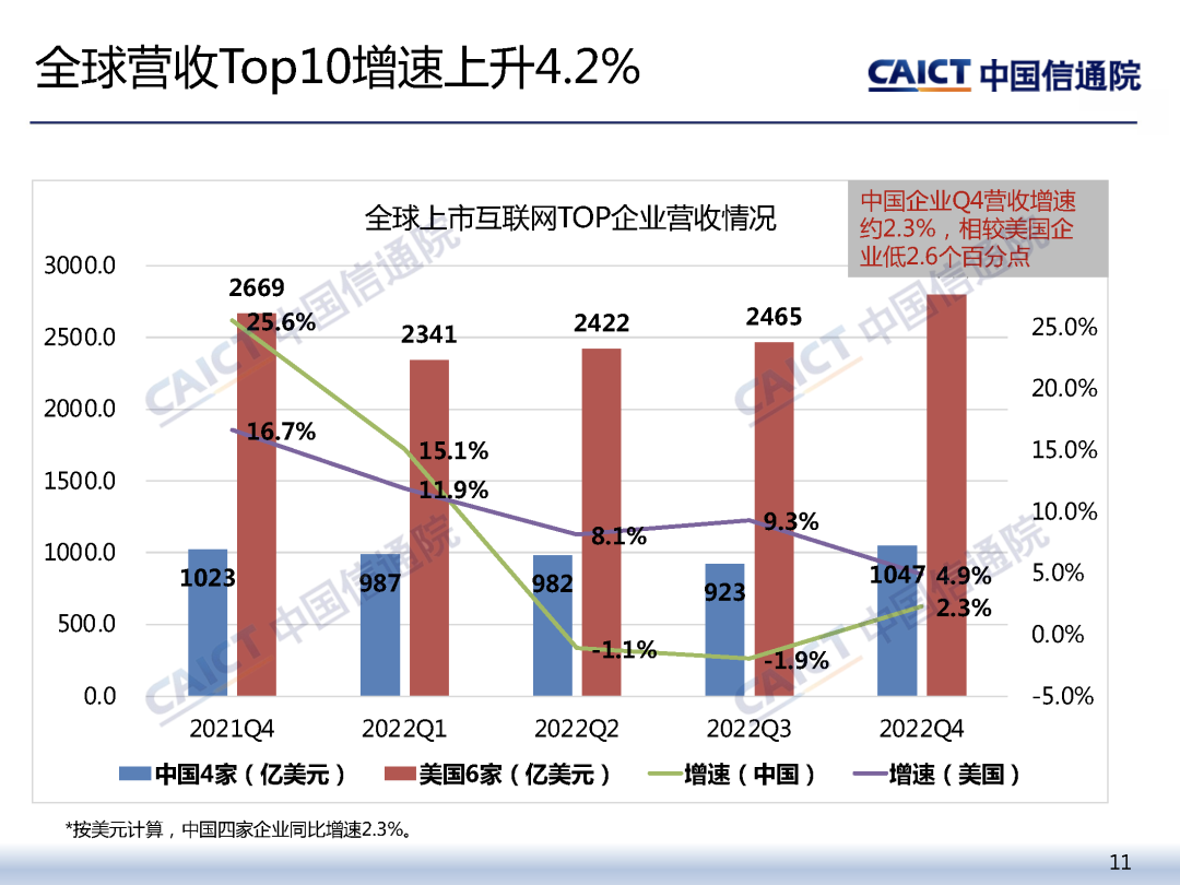 全球方面,Top10企业营收增速达7.2%,中国企业增速低于美国。