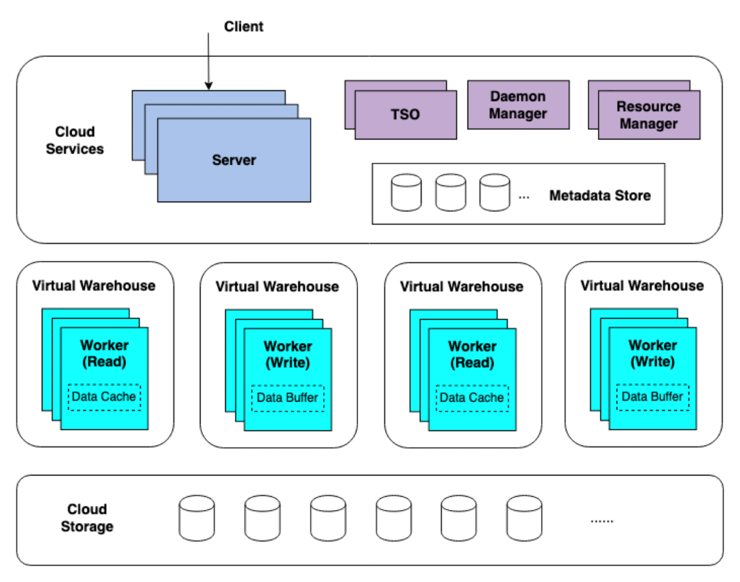 资源隔离:对不同的租户进行资源的隔离,租户之间不会受到相互影响; 读写分离:计算资源和存储资源解耦,确保读操作和写操作不会相互影响; 弹性扩缩容:支持弹性的扩缩容,能够实时、按需的对计算资源进行扩缩容,保证资源的高效利用; 数据强一致:数据读写的强一致性,确保数据始终是最新的,读写之间没有不一致; 高性能:采用了主流的 OLAP 引擎优化,例如列存、向量化执行、MPP 执行、查询优化等提供优异的读写性能。