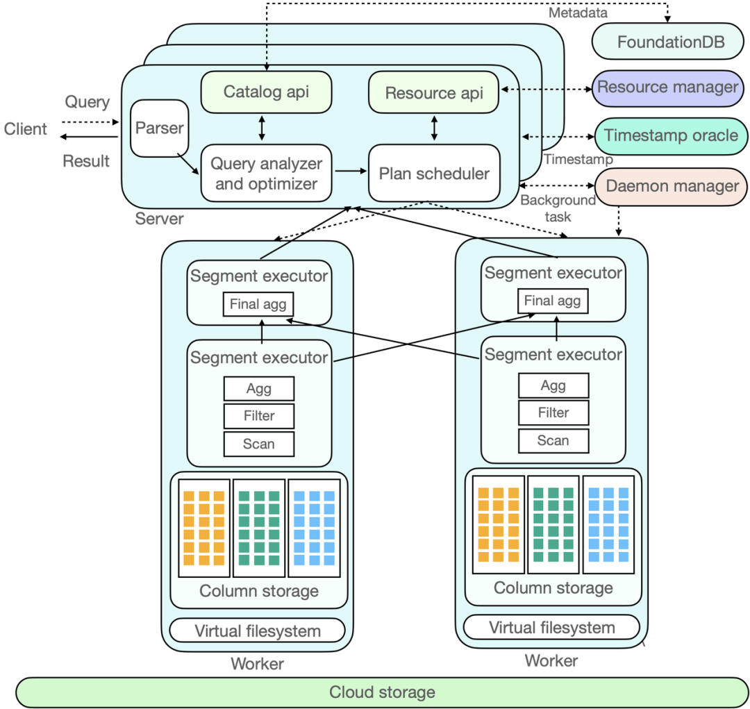 ByConity 还有两个主要的组件,分别是 Time-stamp Oracle 和 Deamon Manager。前者支持事务处理,后者则对后来的一些任务进行管理和调度。