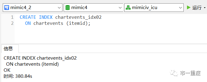 就新建了itemid的所有,index的名字chartevents_idx02只要不与现有的重复就好。on后面写表名和字段名。