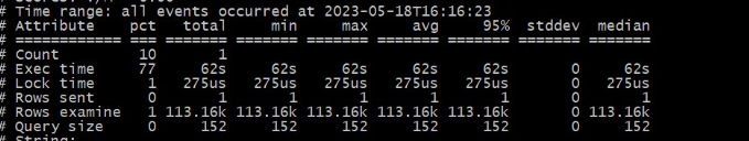 查看慢日志,确实发现一个执行了60多秒的慢sql,但是该sql本身并不慢,是因为其他因素被影响导致很慢。