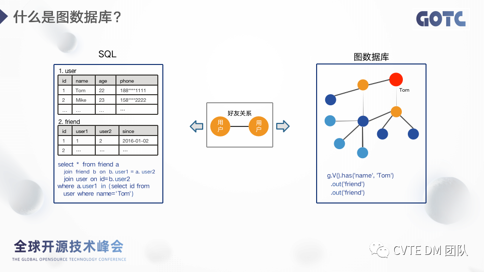 图数据库可以更好更直观地表示实体间地关系,也提供了更便捷的查询语言和更快的关系检索性能,如图所示的 Gremlin 图查询语句,从“Tom”点出发,迭代两次找到所有的好友,相比用SQL表示,语法上更简单直接,灵活度更高,也更利于理解。