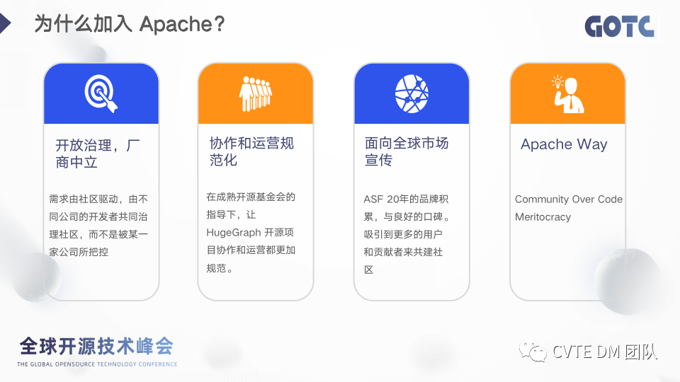 HugeGraph 就是一款高性能分布式图数据库,除了图存储之外,项目还包括了图计算、图可视化、图导入工具、客户端、备份、监控等等,具有完整的图生态。HugeGraph 对 OLTP 和 OLAP 两种常用的查询场景都做了支持,用户可以通过 Gremlin 和 cypher 两种图语言对 HugeGraph 进行操作。还有值得一提的是 HugeGraph 是国内最早开源的图数据库,也是 Apache 软件基金会目前唯一的图数据库项目。1.3 为什么加入Apache?