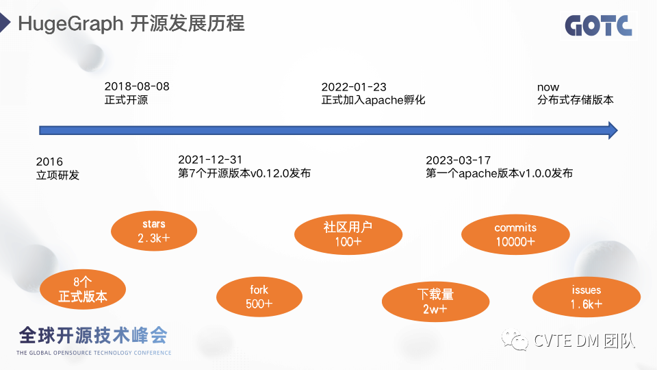 至于为什么会选择加入 Apache ,因为 Apache 组织的项目都是厂商中立,意味着需求由社区驱动,由不同公司的开发者共同治理社区,而不是被某一家公司所把控。另外 Apache 有一套成熟的协作和运营规范,并且会有专业的导师帮助项目的规范化。Apache 是非常强调社区协作的一个组织,Apache Way 的核心就是社区高于代码,这也是 Apache 20年运营总结出来的可持续开源的成功经验。另外,Apache 是一个全球性的组织,20年的口碑大家也是有目共睹,HugeGraph 希望借助 Apache 的影响力能够吸引到更多的用户和贡献者来共建社区。1.4 HugeGraph发展历程