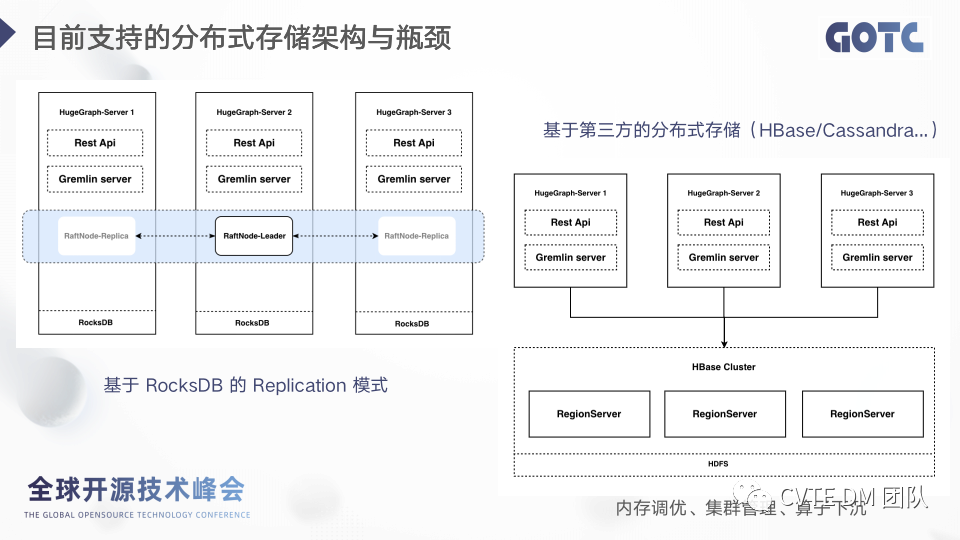 目前版本支持的分布式架构大致可以分为两种,基于 Rocksdb 存储的复制集模式,和基于第三方分布式存储的方式,比如 HBaseBackendStore。这两种架构的弊端都非常明显。· RocksDB 的 Replicate 模式虽然也是基于 raft 对数据集进行复制,能保证数据的一致性,但是每个节点都保留了全量的数据,并没有增加可存储的数据量,只是有了高可用的支持,而且 server 的执行逻辑基本也是串行的。· HBaseBackendStore 的模式,过于依赖 HBase 的存储,HBase 的调优原本就是一件比较复杂的工程,很容易成为瓶颈,特别是内存的调优,HBase 的集群管理挑战也非常大,依赖的组件非常多,HDFS,zk 等等,而且在需要进行条件过滤/或者聚合的场景下,需要拉取数据在 Server 端进行,下推到存储端的成本非常高。所以更好的方案是我们在 Rocksdb Replicate Mode 的基础上支持 shard mode,单 raft group 改造成 multi raftgroup,这样的话为了能有更好地扩展性。基于目前的问题我们看看2.0版本的变化。2.3 HugeGraph 2.0 的重大变化