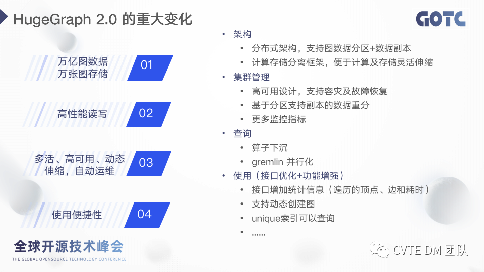 2.0 版本我们有 4 大设计目标,万亿级别的图数据存储万张图存储、高性能的读写效率、支持自动运维、提高用户的使用便捷性。基于此,我们设计了分布式的架构,支持图数据的分区和多副本,并且将存储与计算分离便于灵活地伸缩。分布式带来了海量数据的支持,同时也提升了集群管理的复杂性,所以增加了高可用的设计,支持容灾和故障恢复,以及更多的监控指标等等。在性能方面,因为要跨节点读写数据,无法避免网络传输。因此,在查询上,我们做了很多的针对性优化,包括 Gremlin 并行化、算子下沉。使用上主要是接口的优化和功能的增强。2.4 HugeGraph 2.0 的重大变化-计算