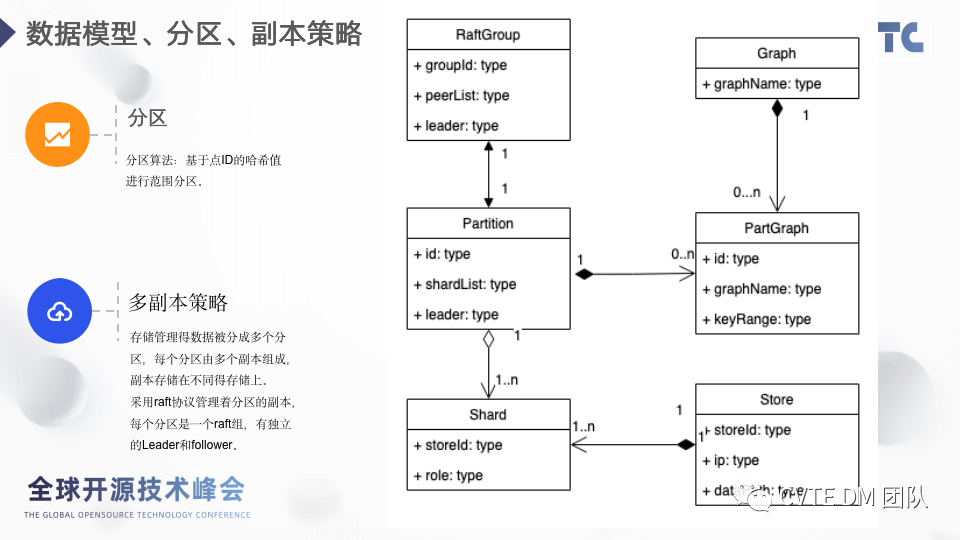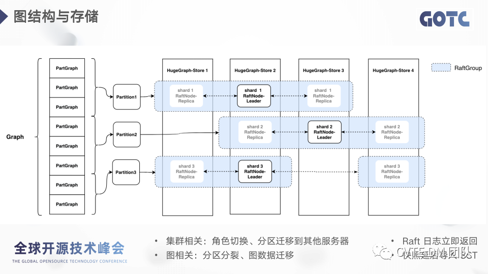 从左往右,一张图划分为多个 PartGraph,多个 PartGraph 对应一个分区,分区与 RaftGroup 一一对应,RaftGroup 内部管理着不同节点之间多个 shard 的同步。