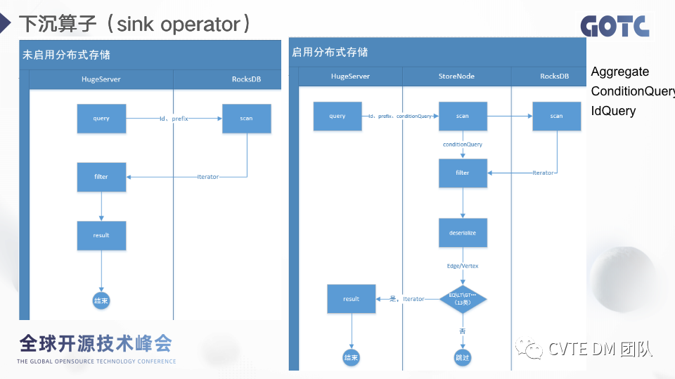 接下来是查询优化的方面,原生的 Gremlin 算子执行逻辑如图所示,举个例子,左上角的gremlin语言表示“查询id为1的点二度的所有节点,并做统计”。gremlin的查询逻辑是根据初始节点1找到邻接节点234,当然他返回的是一个迭代器,然后再把2作为起始节点找到567,再把3作为起始节点,找到678,以此类推,串行执行的逻辑效率非常低下。在这个场景下,我们有两个优化方案。· 一次性获取所有starts,针对所有的starts并行化执行flatmap,获取所有starts的iterator,再将所有iterator合并。· 定义 flatMapBatch 方法,提取出所有的id之后,将所有id传到store端,在store端依靠rocksdb批量获取数据的能力,获取到所有邻节点的迭代器。在 Gremlin 查询中,通常会有多个查询,每个查询有多个结果,因此双层迭代器的结构非常常见,双层迭代器通常用串行的方式一层层执行,我们将第二次迭代逻辑做了并行,并做了测试对比,10个线程的情况下,读效率提升7倍。2.11 算子下沉