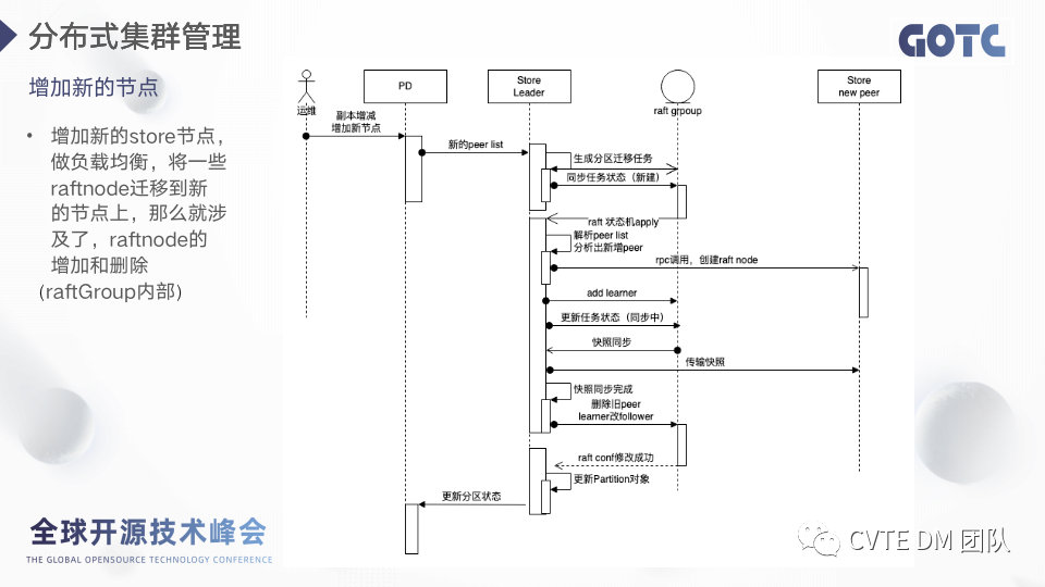 第二个重要的优化点:下沉算子,在单机版本的逻辑中,如果底层存储不支持条件的过滤,我们是先从存储中拿到数据然后通过 server 端的进行过滤。分布式的场景下,如果继续在server端进行过滤,那么需要走网络返回大量的数据,效率非常低下,所以应用了算子下沉的方案在store端把数据处理完成再返回 server 端。2.12 分布式集群管理-增加新的节点(peer迁移)