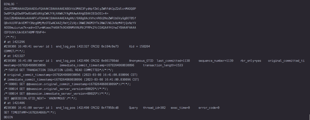 执行结果可以看到,这是一个简单的日志文件,日志中记录了用户的一些操作,这里并没有出现具体的SQL语句,这是因为binlog关键字后面的内容是经过编码后的二进制日志。