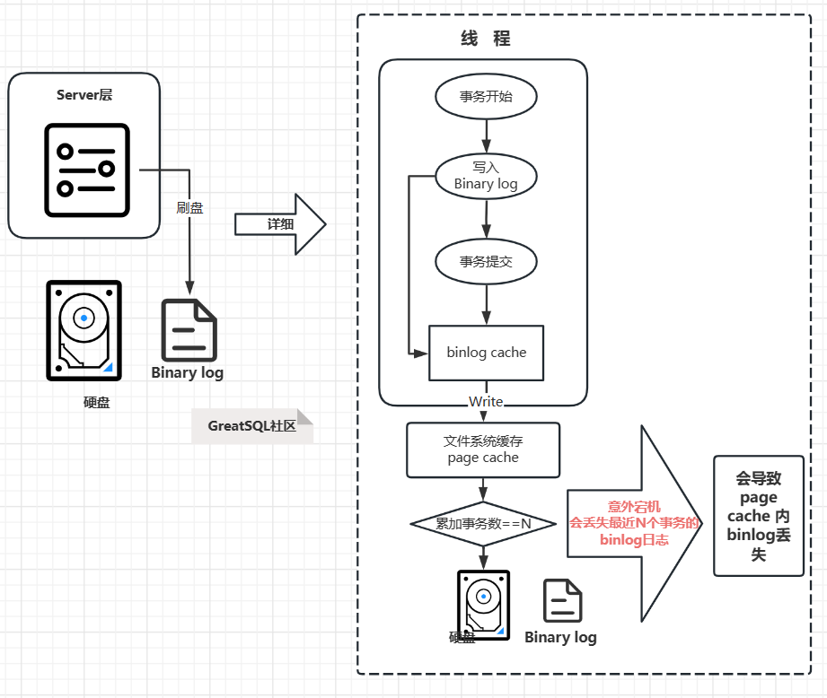 为 0 的时候,表示每次提交事务都只write,由系统自行判断什么时候执行fsync。虽然性能得到提升,但是机器宕机,page cache里面的binglog 会丢失。如下图: