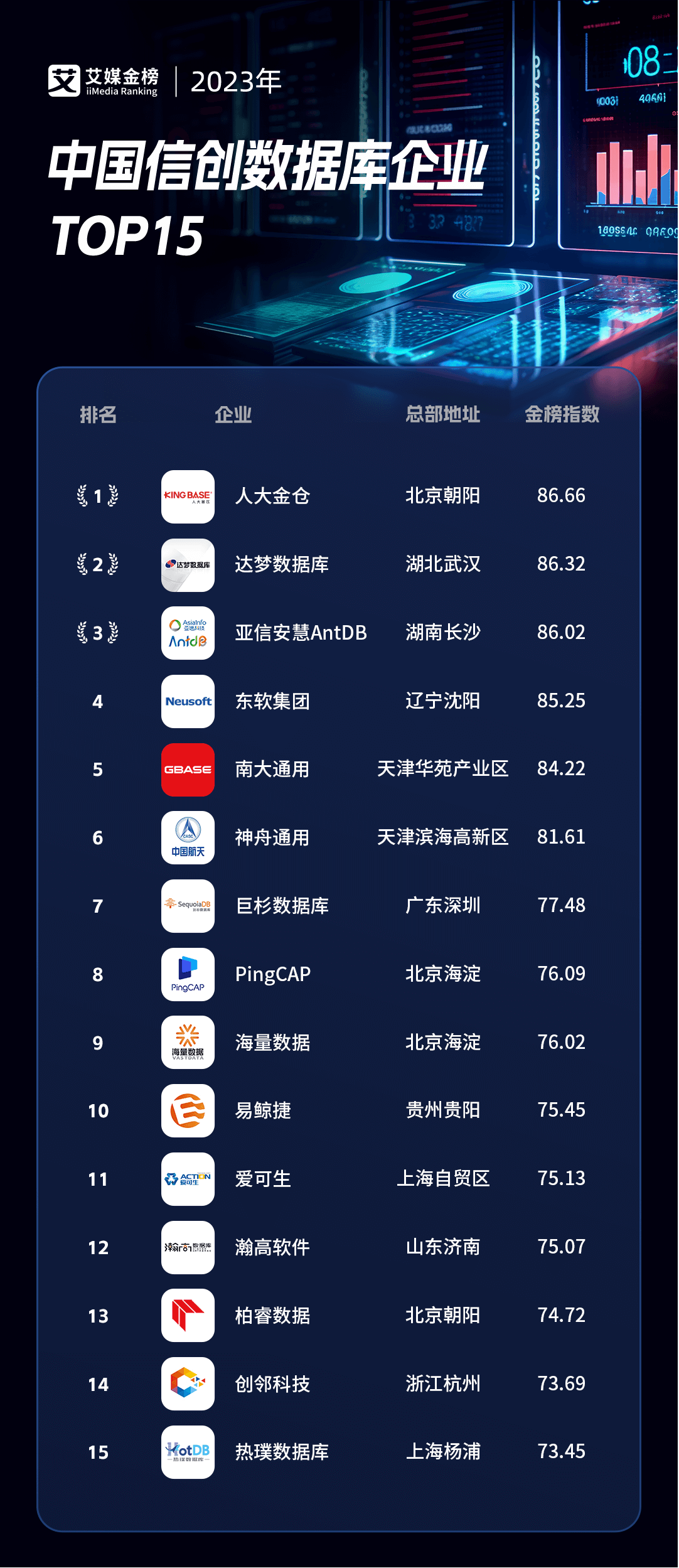 5月24日,艾瑞咨询发布了“2023年中国信创数据库企业TOP15”,人大金仓、达梦数据库、亚信安慧AntDB分别位列前三名。