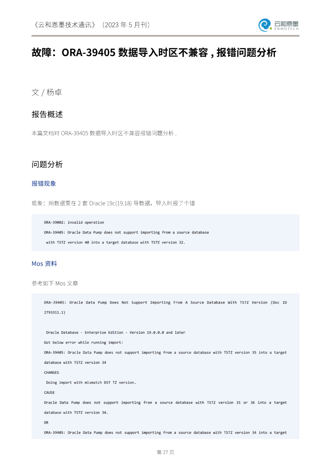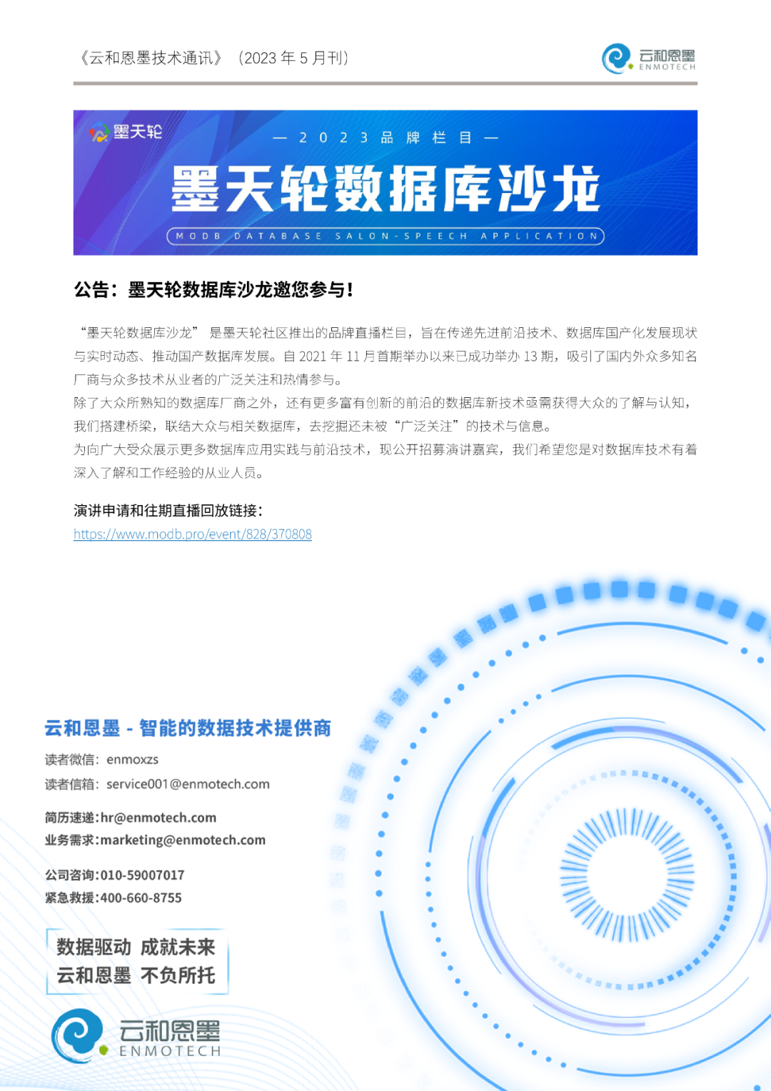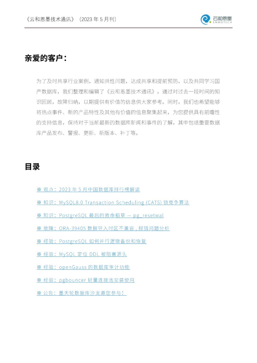 为了及时分享行业案例、通知共性问题、达成共享和提前预防,我们整理和编辑了《云和恩墨技术通讯》,通过对过去一段时间的知识回顾、故障归纳,以期提供有价值的信息供大家参考。同时,我们也希望能够将热点事件、新的产品特性及其他有价值的信息聚集起来,为您提供具有前瞻性的支持信息,保持对于当前最新的数据库新闻和事件的了解,其中包括重要数据库产品发布、警报、更新、新版本、补丁等。