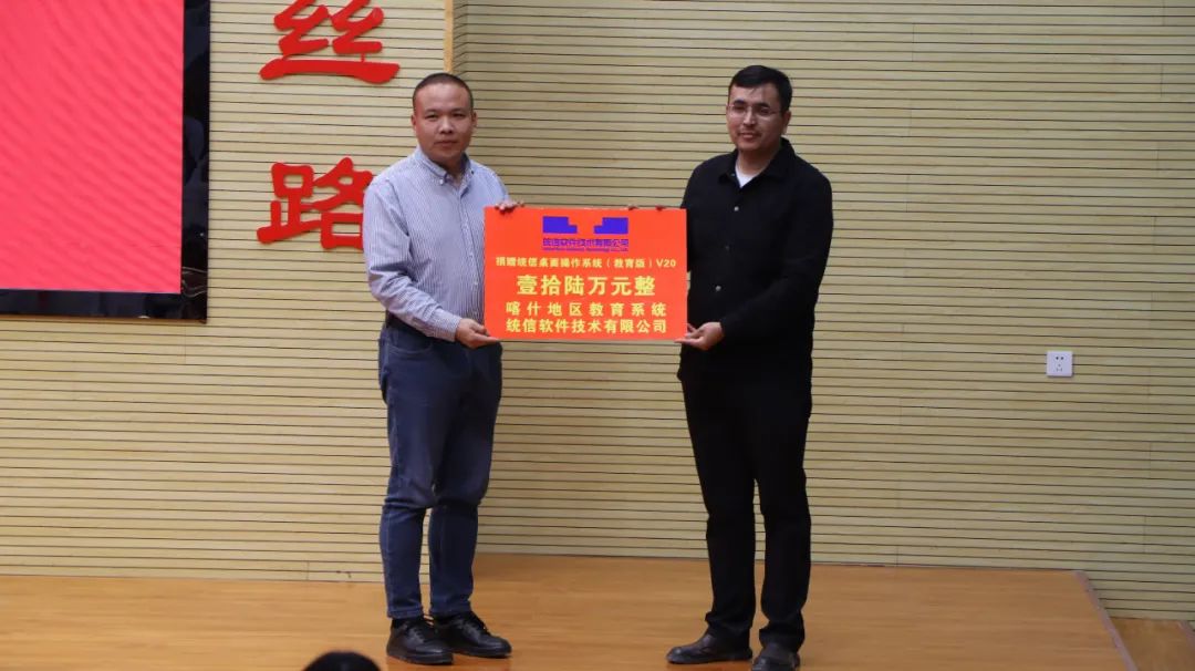 在疏勒县召开的教育信息化应用现场推进会上,统信软件向喀什地区教育系统捐赠了统信UOS桌面版产品,价值拾陆万元整,用于喀什地区各县市教育局及5间机房的建设。