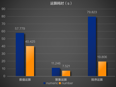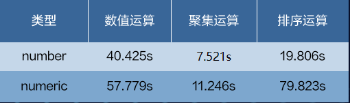 测试结果显示,number的运算、聚集、排序的性能均比numeric有较大的提升,其中排序性能提升约4倍。
