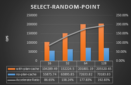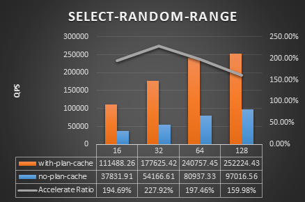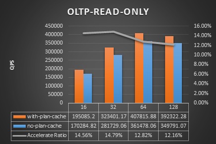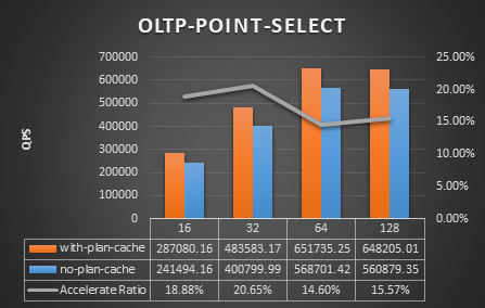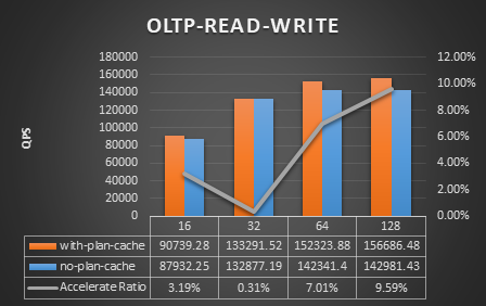 对于使用执行计划缓存和不使用执行计划缓存的场景,基于Sysbench测试集进行了性能测试对比,从测试结果可以看出,在启用执行计划缓存后,各类业务性能均有提升。注意:这些测试只代表相对数字,并不代表实际性能。