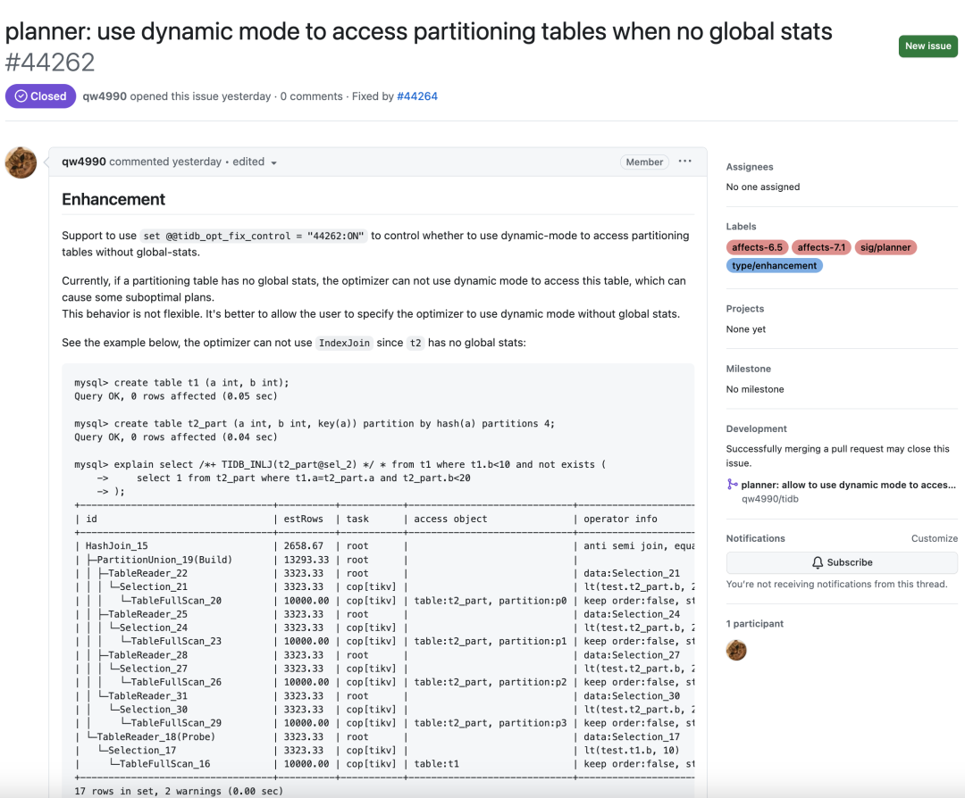 这里常量定义的是44262 这个 issue。这个 issue 可以在 github 上找到相关的说明。这是一个分区表动态裁剪需要 global stats 的问题修复。