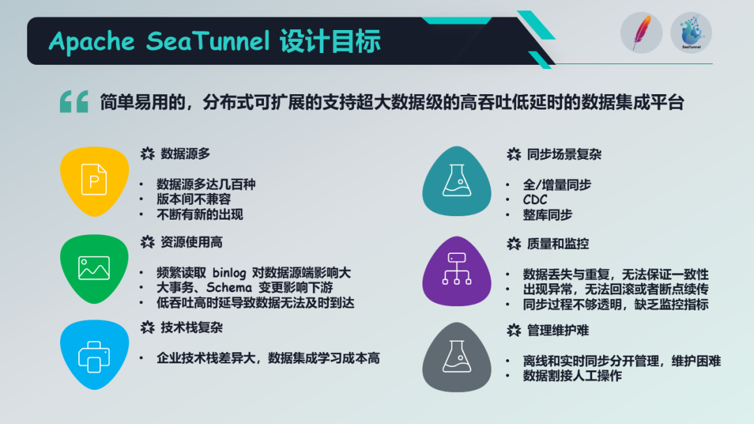 Apache SeaTunnel 是一个高吞吐、低延迟、分布式且可扩展的数据集成平台,旨在应对数据集成面临的多种问题。
