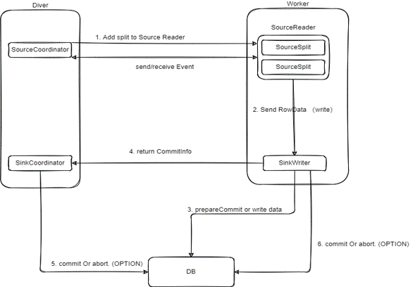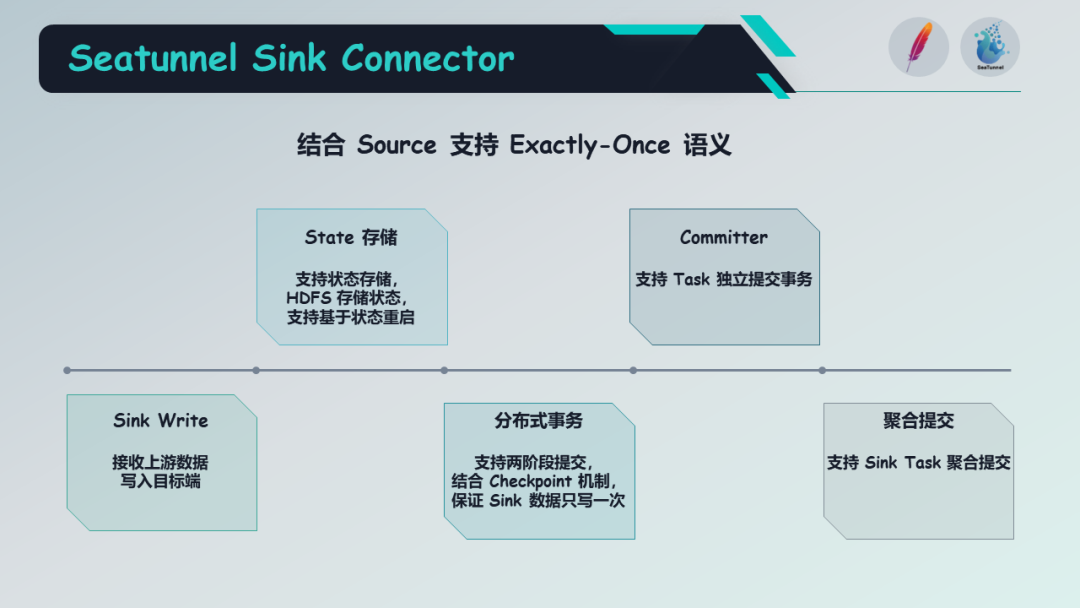 在关于 Sink 的部分,Apache SeaTunnel 的设计结合了源连接器的概念,旨在实现精确一次语义。