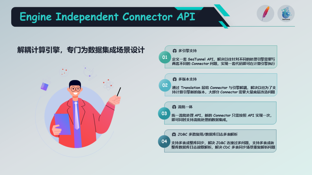 第三部分是分布式事务,Apache SeaTunnel 的 Sink 支持两阶段提交,并结合 Checkpoint 机制,确保精确一致的语义,即保证数据只写入一次。