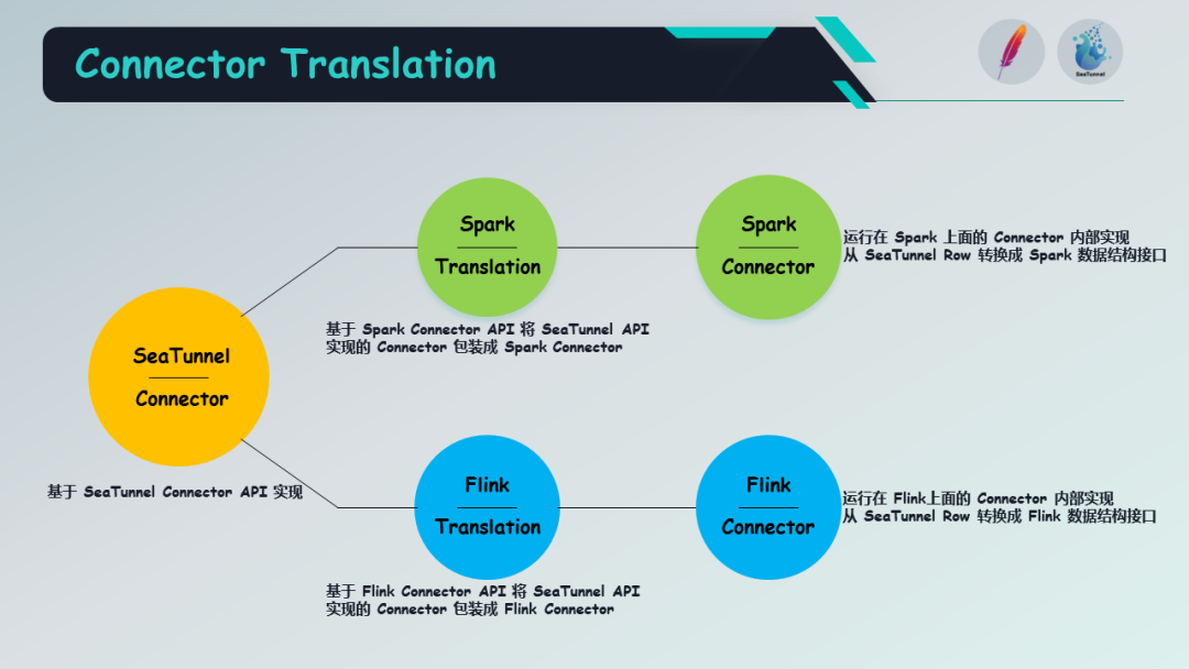 这个翻译层可以根据例如 Spark 的 connector API,将 SeaTunnel 的 API 实现的 connector 包装成一个 Spark connector。