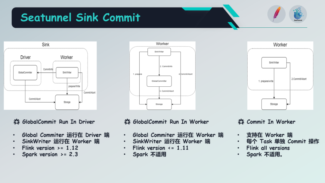 第二种是 GlobalCommit Run In Worker,全局提交器和 Sink Writer 都在工作器端运行,但不适用于 Spark,并且仅适用于 Flink 版本小于 1.11。
