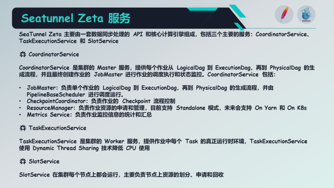 SeaTunnel Zeta 主要由一套数据同步处理的 API 和核心计算引擎组成,其中包括三个主要的服务:CoordinatorService、TaskExecutionService 和 SlotService。