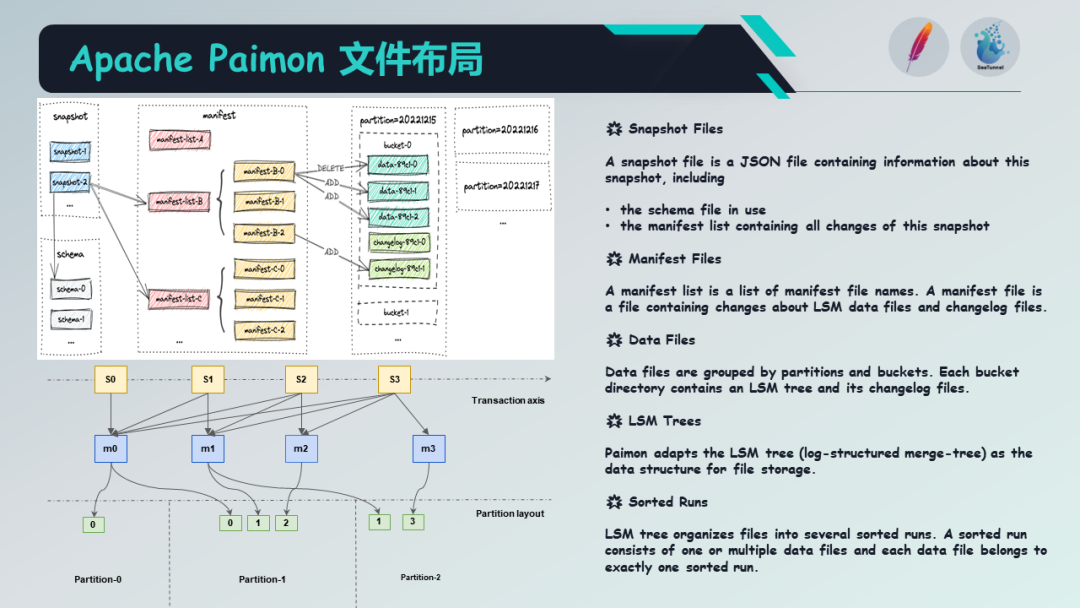 接下来让我们简单了解一下 Paimon 的文件布局。Paimon 的文件布局由快照文件(Snapshot Files)构成。整个文件布局与 Apache Iceberg 类似,即快照由清单列表(Manifest List)组成,而快照中保存了一些模式(Schema)的信息,清单列表由多个清单(Manifest)组成。每个清单由存储桶(Bucket)来决定,而每个存储桶实际上对应一个 LSM 树的数据结构。因此,这就是 Paimon 文件的布局。