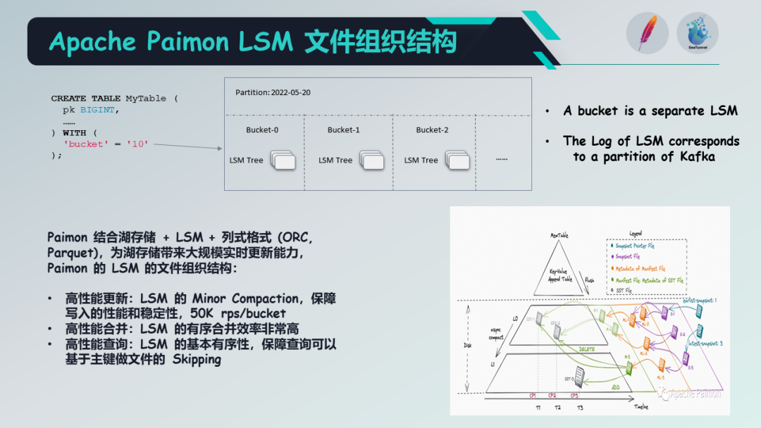 对于每个存储桶来说,它实际上是一个独立的 LSM 树,同时也对应于 Kafka 消息分区。Paimon创新地将湖存储与 LSM 树结合,并利用优势存储格式(如 ORC)来实现大规模实时更新的能力。