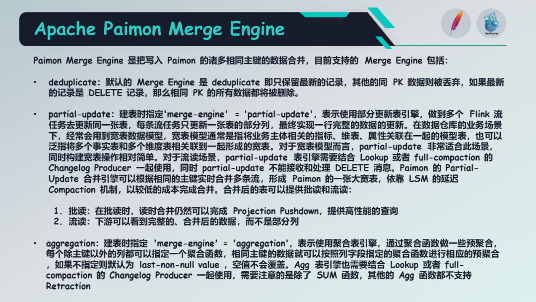 接下来,让我们介绍一下 Paimon 中的合并引擎(Merge Engine)。Paimon的合并引擎用于合并具有相同组件的写入数据。Paimon 主要支持以下三种合并方式。