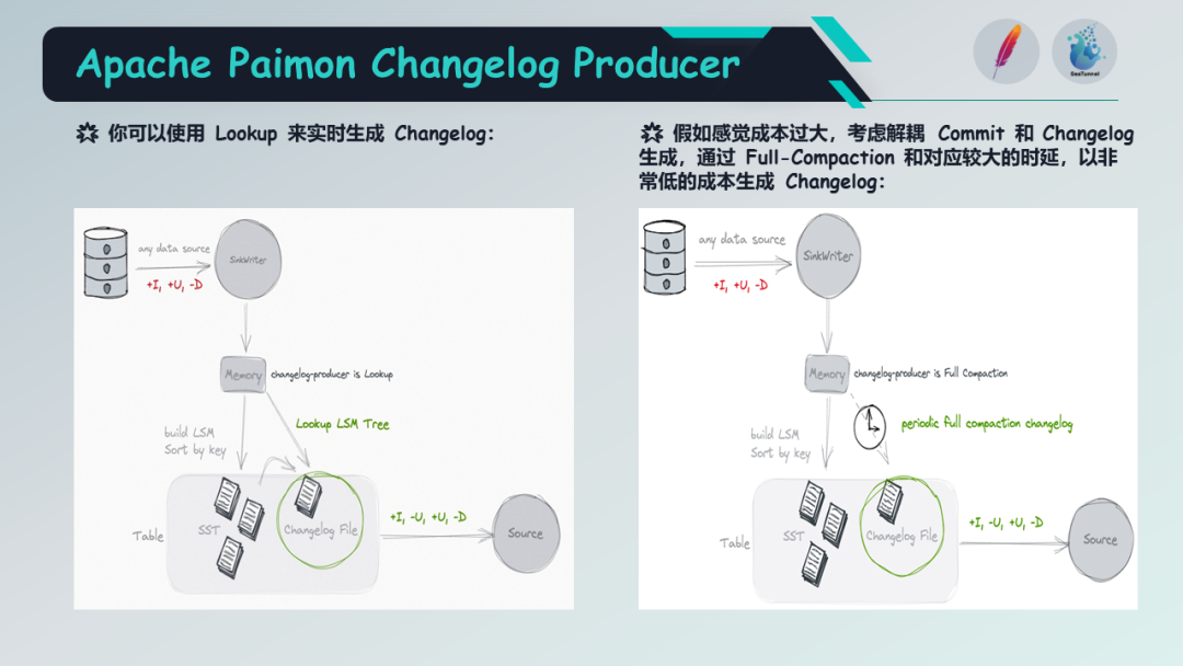 如果觉得使用 Lookup 来实时生成 Changelog 成本过大,你也可以解耦 Commit 和 Changelog 生成,通过 Full-Compaction 和对应较大的时延,以非常低的成本生成 Changelog。