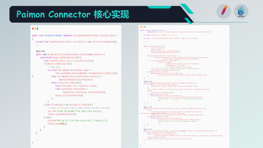 有了这些API,例如 Write和 Commit 等 API,我们就可以实现 Apache SeaTunnel 的 Paimon 连接器。