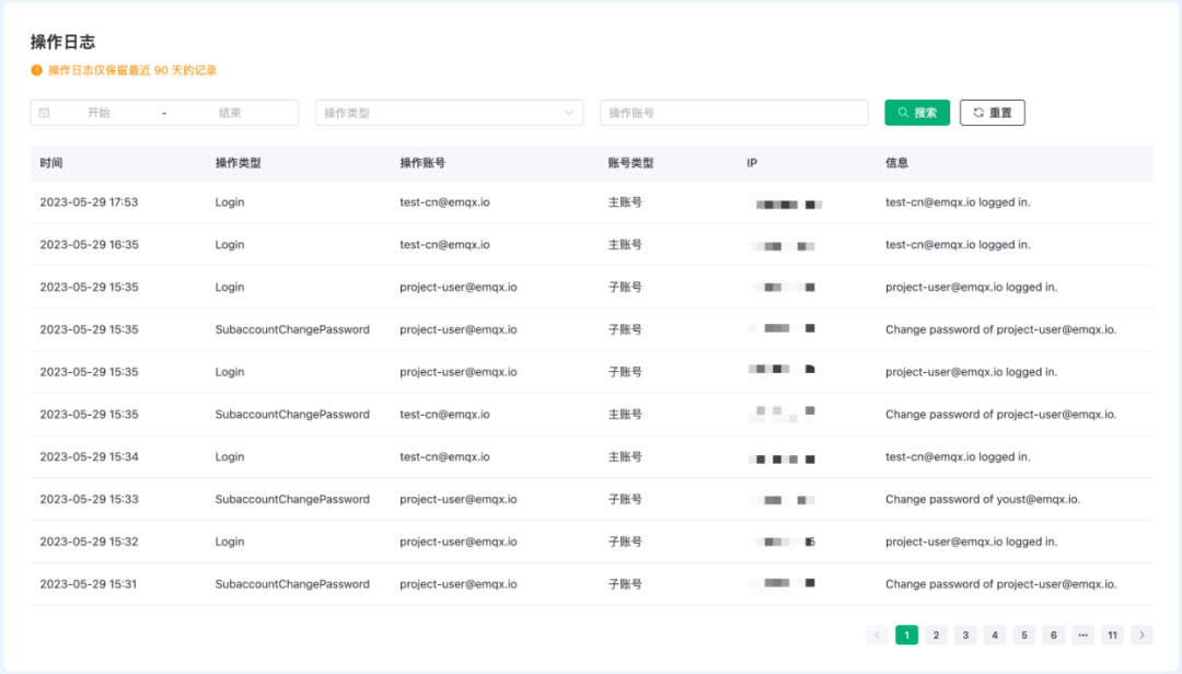 EMQX Cloud 控制台的操作日志模块记录了多种事件,包括但不限于账号登录、部署相关事件、TLS 配置、VPC 配置、数据集成配置、增值服务相关事件、子账号操作和财务相关事件等。控制台管理者可以使用操作日志模块清晰地了解关键操作和事件发生的时间、操作者、源 IP 地址和详细信息等。这些信息可以帮助您更好地追踪和识别异常操作,并增强平台的安全性和合规要求。