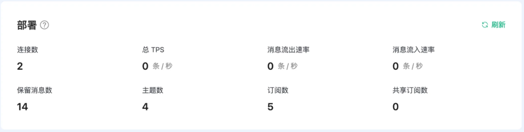 监控页部署指标区域的新增指标不仅提供了更多有用信息,而且可以更加全面地了解部署的运行状况。现在包含:当前部署连接数、总 TPS、消息流入 TPS、消息流出 TPS、保留消息数、主题数、订阅数、共享订阅数。这些指标的新增可以帮助用户更好地监控和管理部署,及时发现并解决潜在问题,从而提高系统的可靠性和稳定性。