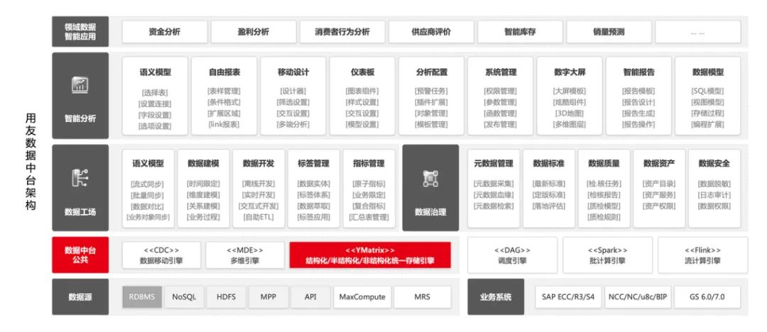 作为国内领先的企业软件提供商,用友已成功帮助众多企业客户完成规模化的业务系统建设,积累了丰富的产业数字化经验,在业务架构、应用开发与集成、数据治理、数据运营、数据算法等方面具备成熟的产品覆盖及丰富的项目经验,并具备咨询规划、实施交付、运营维护、培训赋能等全链路专业服务能力。用友 YouBIP iUAP平台,定位企业数智化新底座,基于中台能力化架构,提供从理论体系到落地方法论的全套支撑工具,赋能企业中台建设,将传统功能改造为可复用、可扩展、可运营的能力,支撑企业数智化商业创新。