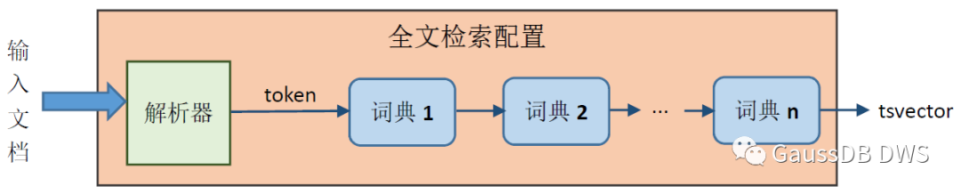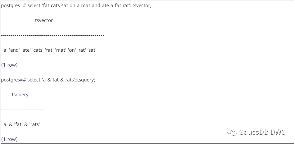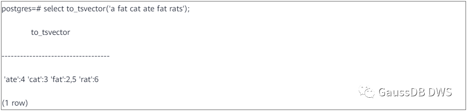 GaussDB(DWS)中,原始的文档和搜索条件都用文本(text)表示,或者说,用字符串表示。经过预处理后的文档变为tsvector类型,通过函数to_tsvector来实现这一转换。例如:
