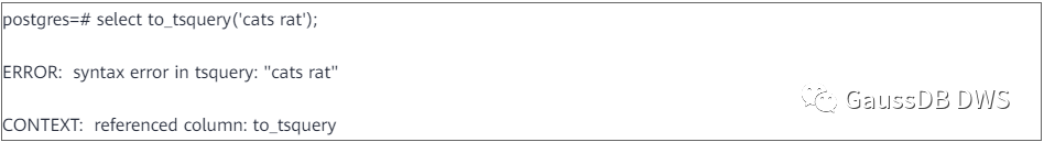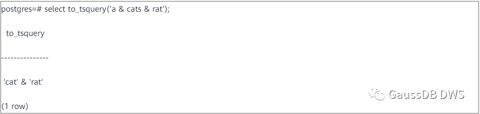 跟to_tsvector类似,to_tsquery也会对输入文本做去掉停用词、标准化等操作,例如去掉了“a”,把“cats”变成“cat”等。