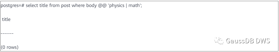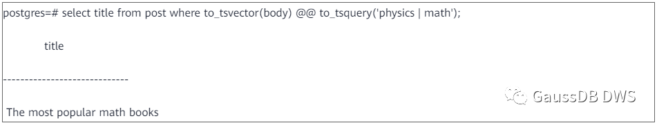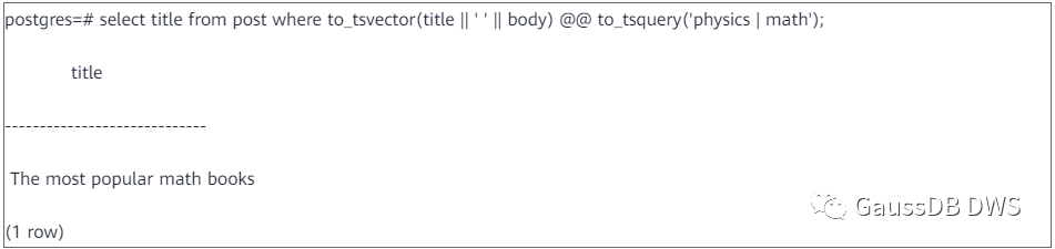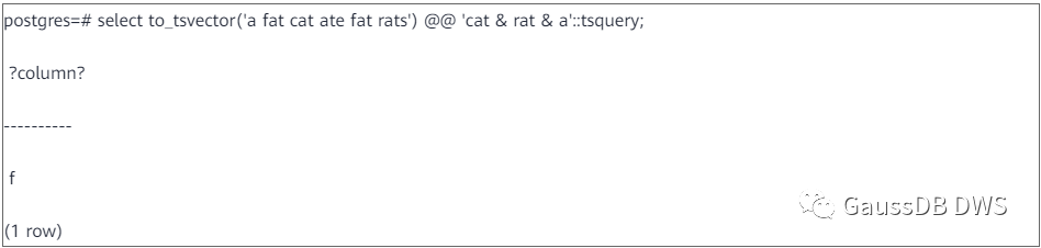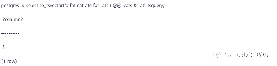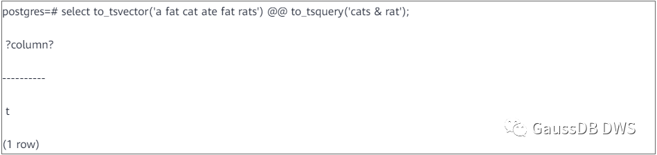 把输入文档和检索条件转换成tsvector和tsquery之后,就可以进行模式匹配了。GaussDB(DWS)中使用“@@”操作符来进行模式匹配,成功返回True,失败返回false。
