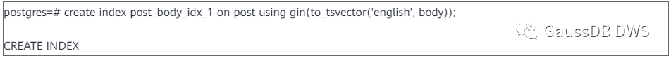 前文提到,逐个扫描表中的文本字段缓慢低效,而索引查找能够提高检索的速度和效率。GaussDB(DWS)支持用通用倒排索引GIN(Generalized Inverted Index)进行全文检索。GIN是搜索引擎中常用的一种索引,其主要原理是通过关键字反过来查找所在的文档,从而提高查询效率。可通过以下语句在text类型的字段上创建GIN索引: