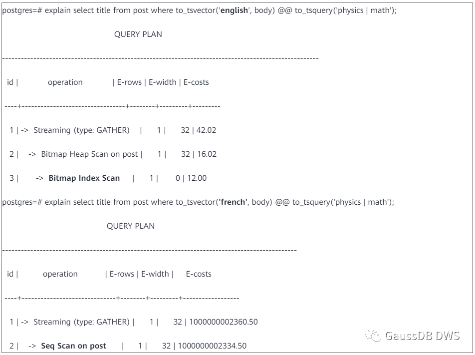 注意这里必须使用to_tsvector函数生成tsvector,不能使用强制或隐式类型转换。而且这里用到的to_tsvector函数比前一节多了一个参数’english’,这个参数是用来指定文本搜索配置(Text search Configuration)的。关于文本搜索配置将在下一节介绍。不同的配置计算出来的tsvector不同,生成的索引自然也不同,所以这里必须明确指定,而且在查询的时候只有配置和字段都与索引定义一致才能通过索引查找。例如下面的查询中,前一个可以通过post_body_idx_1来检索,后一个找不到对应的索引,只能通过全表扫描检索。