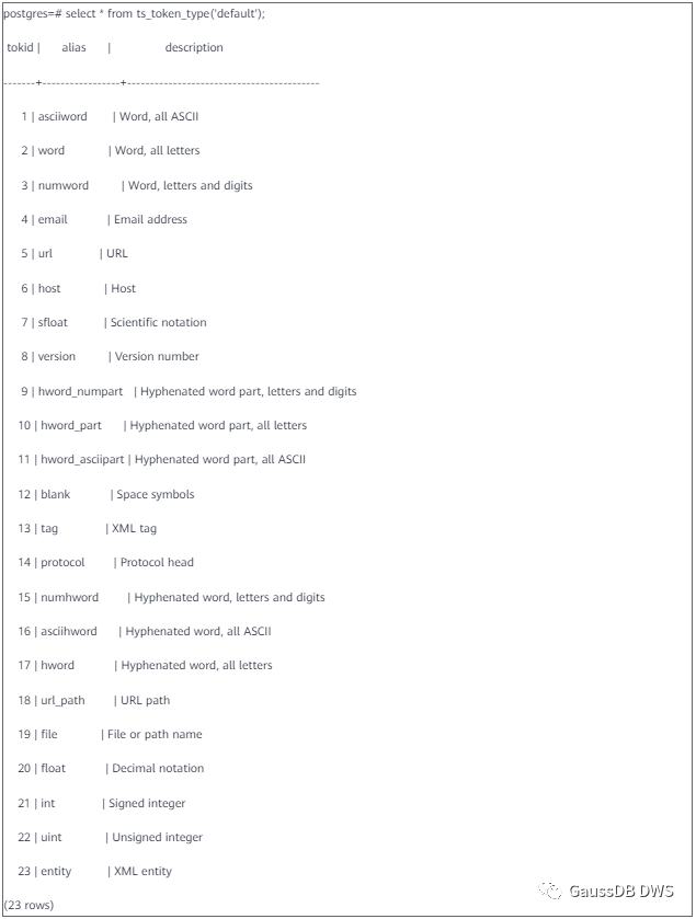 上面语句中的“asciiword”是一种token类型。解析器会对分解出的token做分类,不同的解析器分类方式不同,可通过ts_token_type函数查看。例如,‘default’解析器将token分为如下23种类型:
