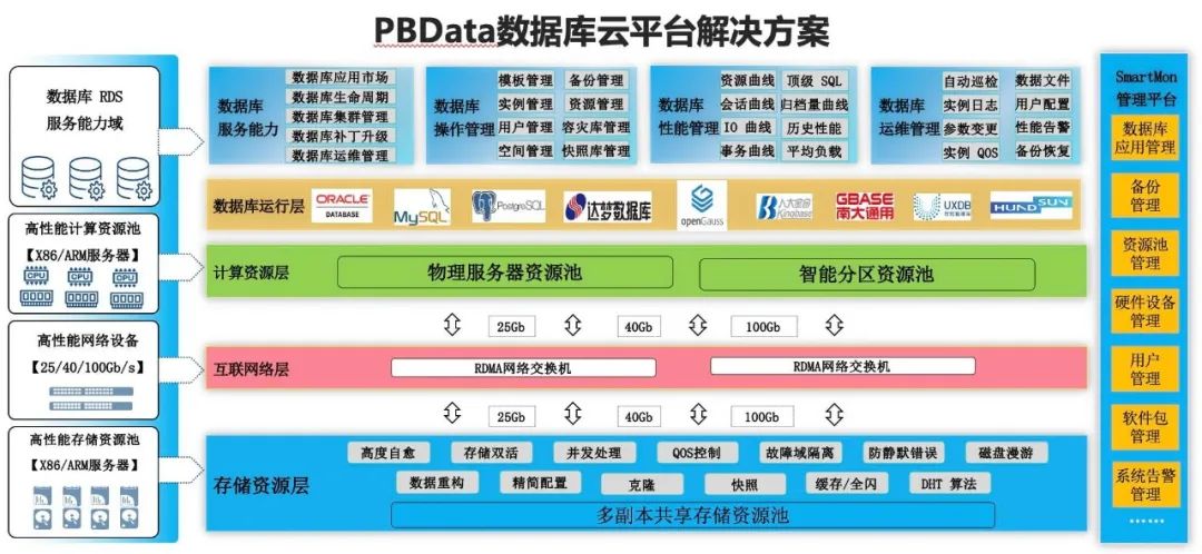 此次参与评测PBData数据库云平台是由上海天玑自主研发的数据库计算存储资源一体化支撑平台。本产品方案通过软件定义基础设施理念及分布式技术,结合主流X86/ARM架构服务器、高带宽、低时延的RDMA网络设备预适配集成,为“2+8+N”行业用户的核心业务系统提供高性能、高可靠、弹性伸缩、高安全性、高效智能运维等特性的计算存储资源平台,可以承载 Oracle、MySQL、PostgreSQL、达梦、openGauss、人大金仓KingBase、南大通用 GBase、恒生电子LightDB等主流数据库。