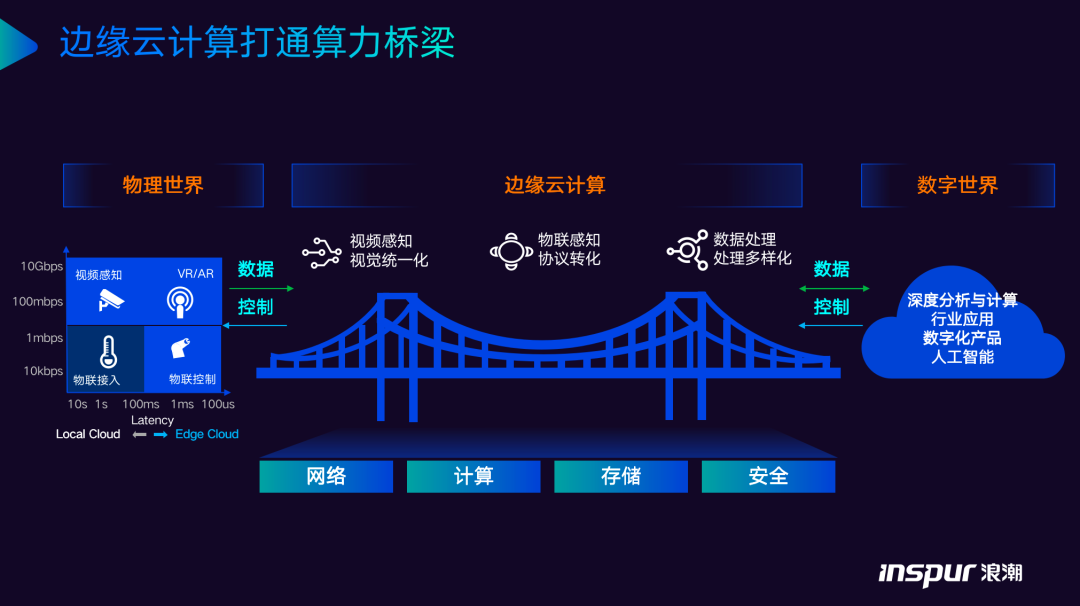 在交通基建、能源管控场景中,浪潮云将云服务能力通过中心云、本地云、边缘云的三层网络打通。结合企业数字化转型需求,重点面向智慧桥梁、光伏发电、碳排放管控等典型场景,将现场边缘数据依托边缘节点的物联网感知及视频感知能力进行实时采集。同时结合近场边缘服务打造数据中台和业务中台,实现模型的构建、分析与开放。最后通过云边缘与应用场景相结合,打造精细化工具管理、进度管控、物料精准配发、实时监控、智能运维、智能巡检等创新应用场景及数字化解决方案。实现全要素、全周期、全链条的数据融合、应用赋能,铸就工业应用新引擎。