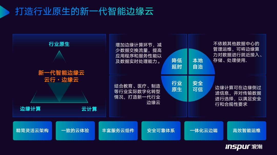 浪潮云行·边缘云产品作为浪潮分布式云中最重要的产品之一,依托边缘云计算技术和行业原生技术融合,全面打造行业原生的新一代智能边缘云,具有降低时延、本地自治、行业原生、安全可信等特点,具有精简灵活云架构、一致的云体验、丰富服务云组件、安全可靠体系、一体化云边端、高效智能运维等优势。依托浪潮云多年技术沉淀、聚焦政企客户业务的边缘计算需求,将云服务能力从中心下沉到边缘。浪潮云行·边缘云产品包含浪潮轻量级云服务平台ICP Edge及浪潮边缘云软硬一体化产品IEC,为用户提供覆盖云边缘、近场边缘、现场边缘的全场景行业原生边缘云服务。