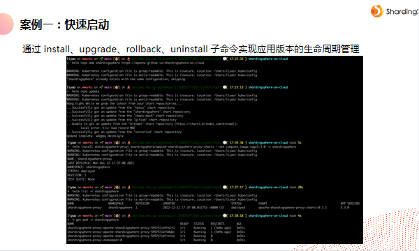 ShardingSphere-on-Cloud当前状态支持 Helm 开箱即用的 ShardingSphere Proxy;支持 Helm 交付的 ShardingSphere-Operato;支持 AWS CloudFormation 快速启动一套多可用区部署的 ShardingSphere Prox;支持上述 CloudFormation 的 Terraform 可编程定义模板。