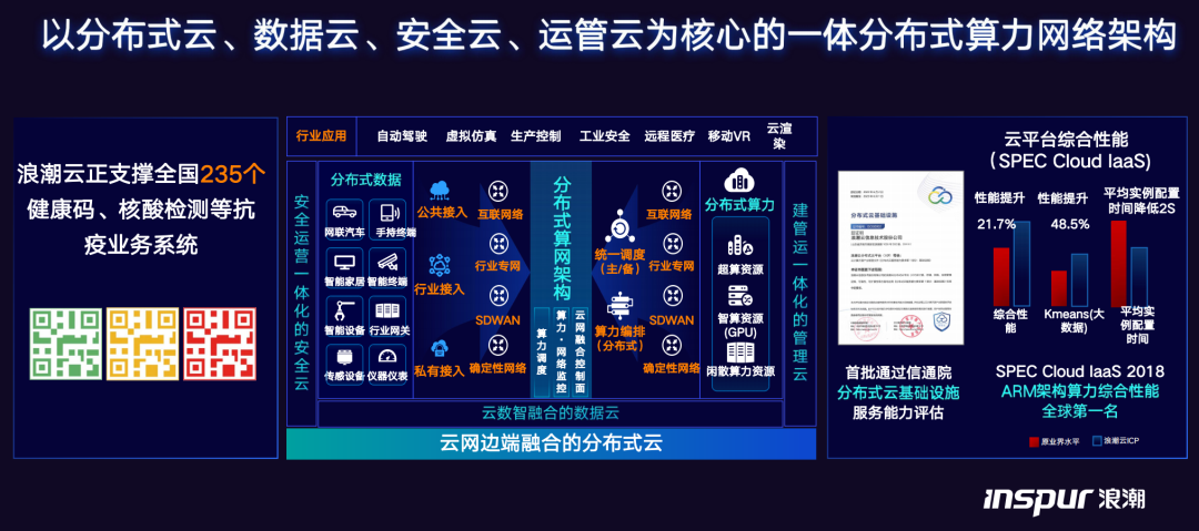 分布式云其实是一个统一的体系,实现节点与节点之间的统一架构,一致体验,一云多芯。分布式云消耗的资源也是一个完整的体系,可以跟X86完全适配,既有合规能力,又有云的应用。浪潮云的分布式云布局是全国领先的,在一些行业报告里跻身分布式云市场前列,支撑了两万多个政府服务体系。在云布局过程中,浪潮拥有专业化的运营,分布式云在线上是数据的价值激活,数据的价值激活通过实现数据的汇聚流通挥价值。浪潮云分布式云基于政务领域,通过数据存储、数据分析,构建了一体化的数据化平台,积累了丰富的经验,包括行业模型、算法等专家库的沉淀,进一步推向其他行业。依托数据理论建设的模式,为客户提供云产品的技术能力,让产品、服务都能满足一体化的输出。